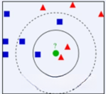 - 如果K=5,绿色的圆最近的五个邻居分别是:两个红色的三角形和三个蓝色的正方形那我们就少数服从多数,基于统计的方法,判定绿色的圆属于蓝色正方形这一类。