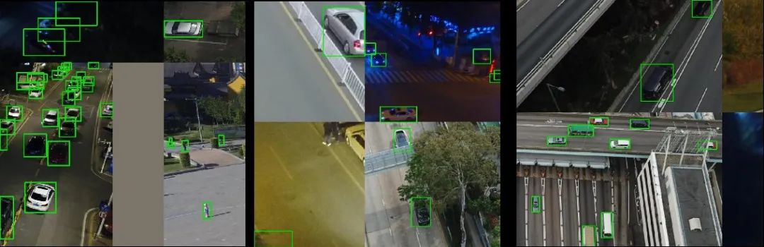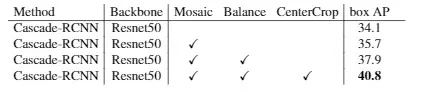 用中心裁剪的方式,随机在原图上裁剪320~960大小的区域,然后把它们resize为相近的尺度,以缓解目标尺度不一致的问题。上面第一行是在原图中切了960×960大小,第二行是切了320×320大小,把它们resize到同一个尺度(如640×640),相当于达到了小目标放大、大目标缩小的目的。并且对于边界目标是全保留的策略。