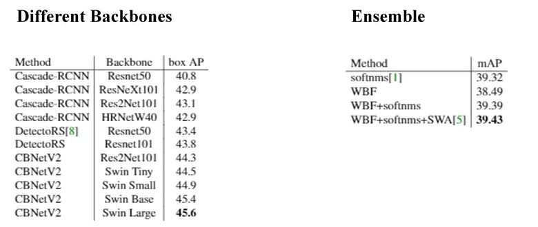 1)soft nms + WBF,根据预测的score分段集成的,大于等于0.1用WBF,小于0.1用soft_nms。目的是既可以提高高分框的定位精度,增加召回从而提升mAP;2)模型集成,使用不同backbone以及pipeline训练。