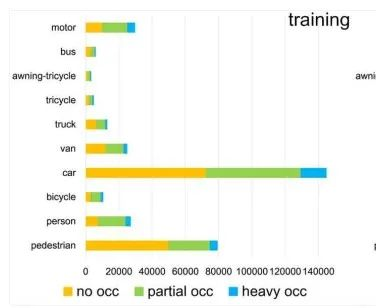 上图为每一类数据在训练集中的数量(举例:6471张训练集中,有1150张包含awining-tricycle这个类),将每一类图片数量小于4000张的,通过随机加噪声、改变亮度、cutout等方式扩充为4000张,以缓解类别不平衡的问题。