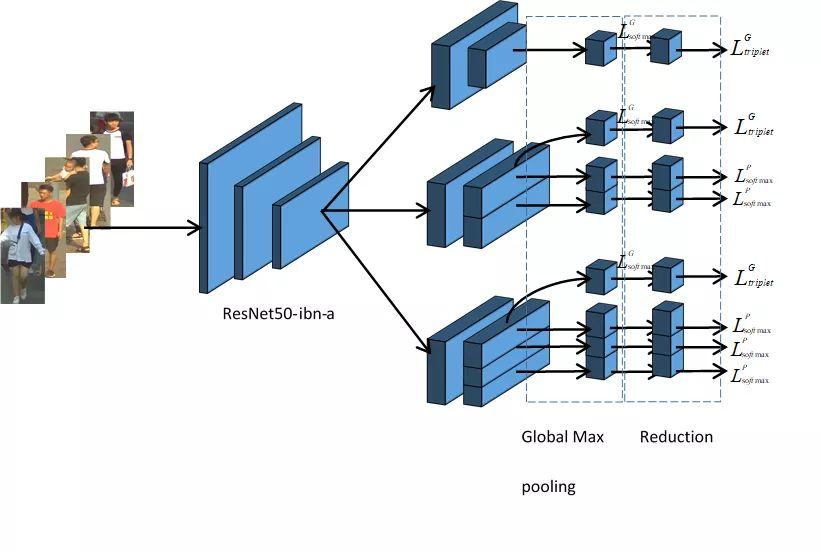 MGN把全局和局部的特征结合在一起,能够有丰富的信息和细节去表征输入图片的完整情况。在观察中发现,确实是随着分割粒度的增加,模型能够学到更详细的细节信息,全局特征跟多粒度局部特征结合在一起,思路比较简单,全局特征负责整体的宏观上大家共有的特征的提取,然后把图像切分成不同块,每一块不同粒度,它去负责不同层次或者不同级别特征的提取。