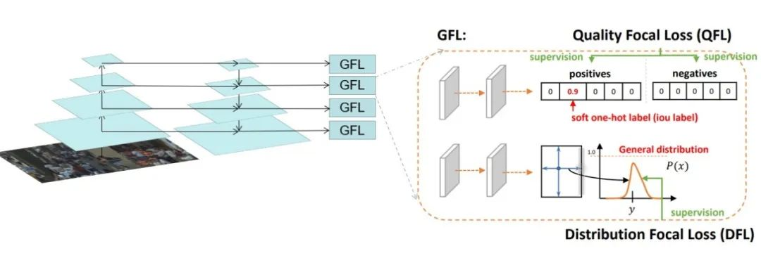 QFL专注于asparse set of hard examples,同时在相应的类别上产生它们的连续0~1之间的localizationquality estimation;DFL使网络能够在任意和灵活的分布下,学习bounding boxes在连续位置上的概率值。