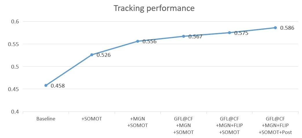 本次采用的多目标跟踪系统是DeepBlueAI团队长时间以来总结的一套比较好的pipeline,在竞赛中多次取得不错的成绩,基于Detection和Embedding分离的方法,团队采用了以GeneralizedFocal Loss(GFL)为损失的anchor-free检测器,并以MultipleGranularity Network (MGN)作为Embedding模型。在关联过程中,DeepBlueAI团队借鉴了DeepSORT和FairMOT的思想,构建了一个简单的在线多目标跟踪器。