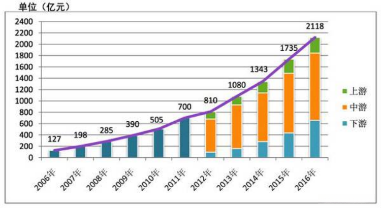 2006年~2016年我国卫星导航与位置服务产业产值分布图