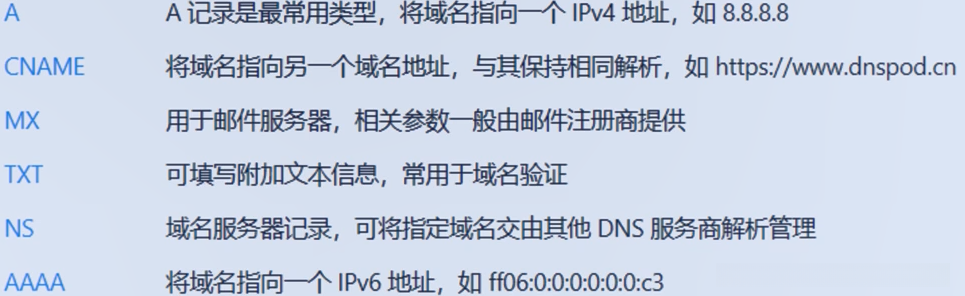 假设我注册了一个域名,他人访问该域名,就会通过DNS服务器查询表,映射对应的IP地址.那么,我们对自身的域名进行了怎样的配置设置,或者对我们的子域名又有什么样的配置需求,都会在这个位置进行设置.具体来说,会记录哪些类型的信息呢