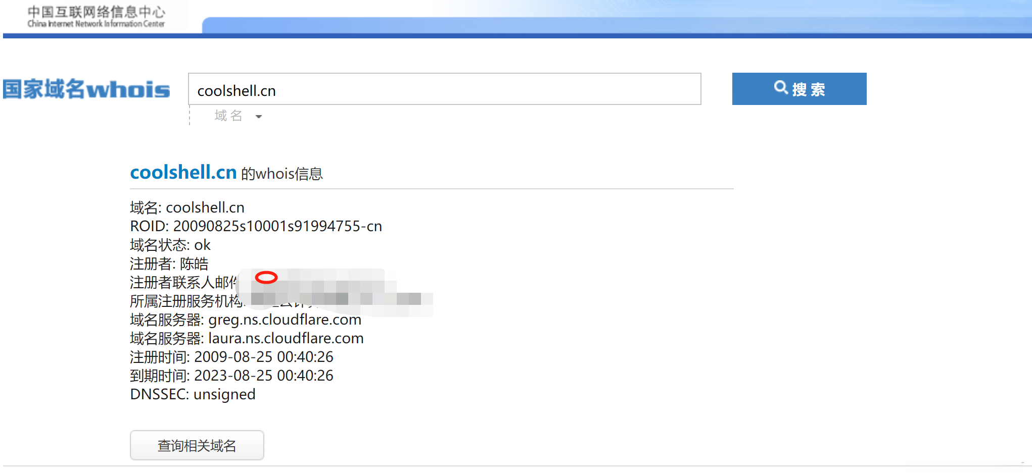通过点击whois功能, 可以获取该域名下的详细信息。值得注意的是, 该顶级域名为VeriSign所负责管理, 而针对.cn域名的注册则由CNNIC进行管理。