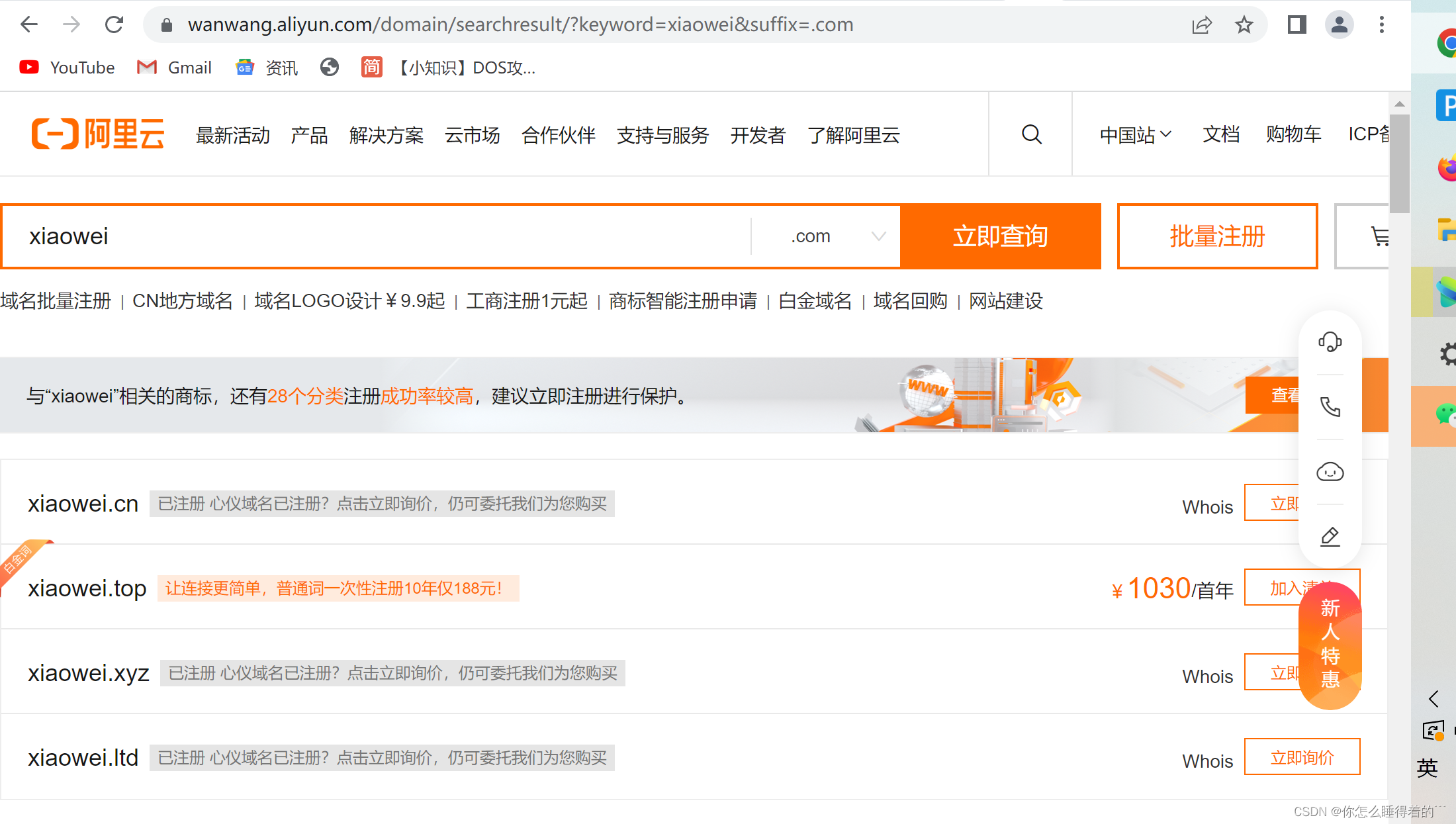 在域名注册_域名查询_域名申请_域名购买_域名续费_国际域名-万网-阿里云旗下品牌以小伟为例