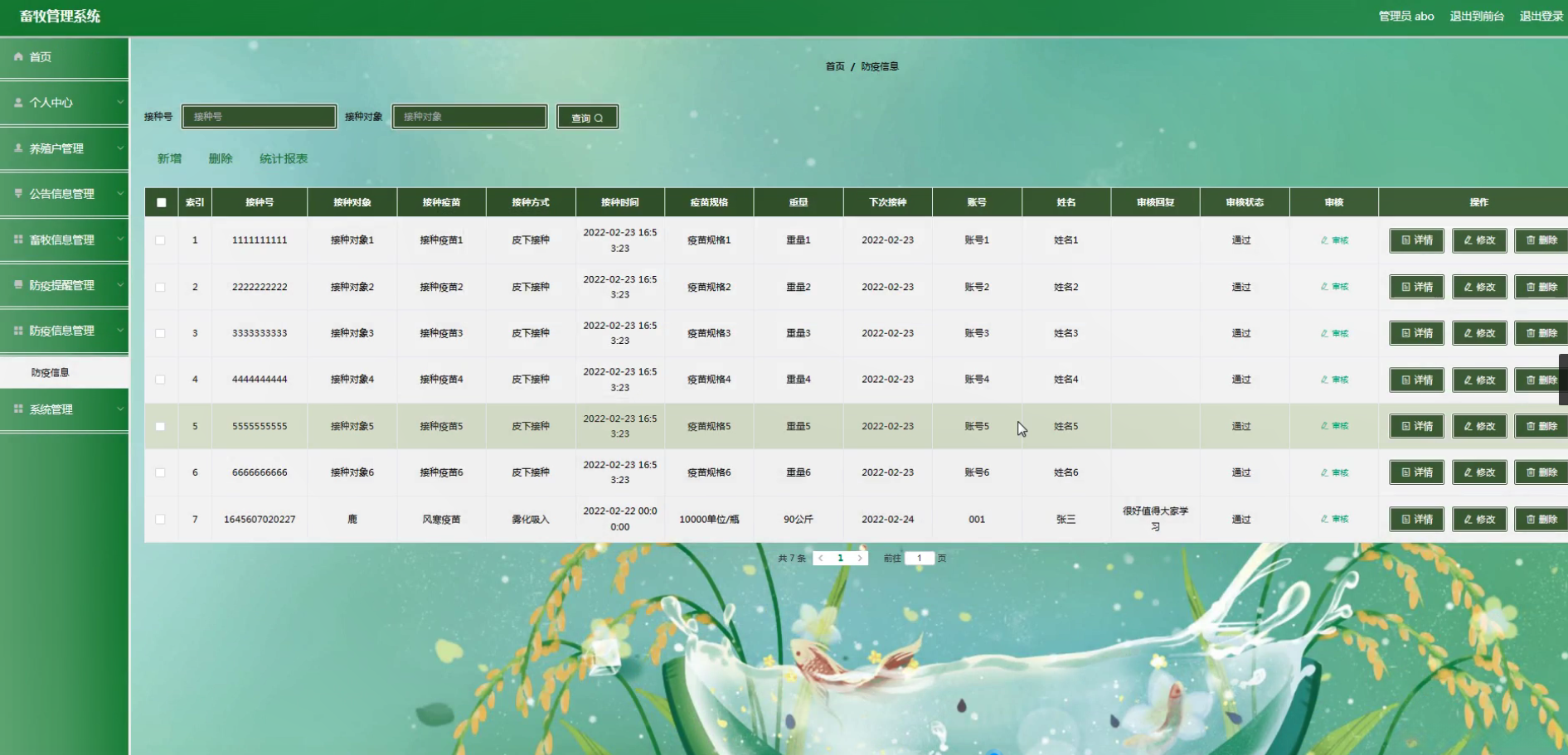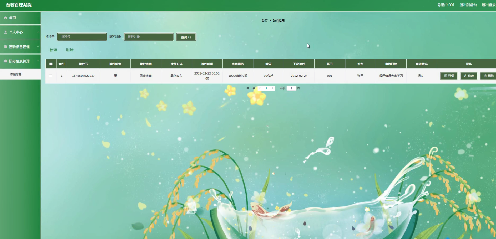 防疫管理和健康监测是畜牧业运营的关键要素之一。该系统需要具备根据动物生理周期以及疫苗接种规划生成预防建议的能力,并通过多种渠道向养殖户发送相关通知以确保生产安全。此外, 系统还应提供疾病预警信息以及疫情数据统计功能, 以便于养殖者及时掌握疫情发展规律, 制定科学合理的防控策略