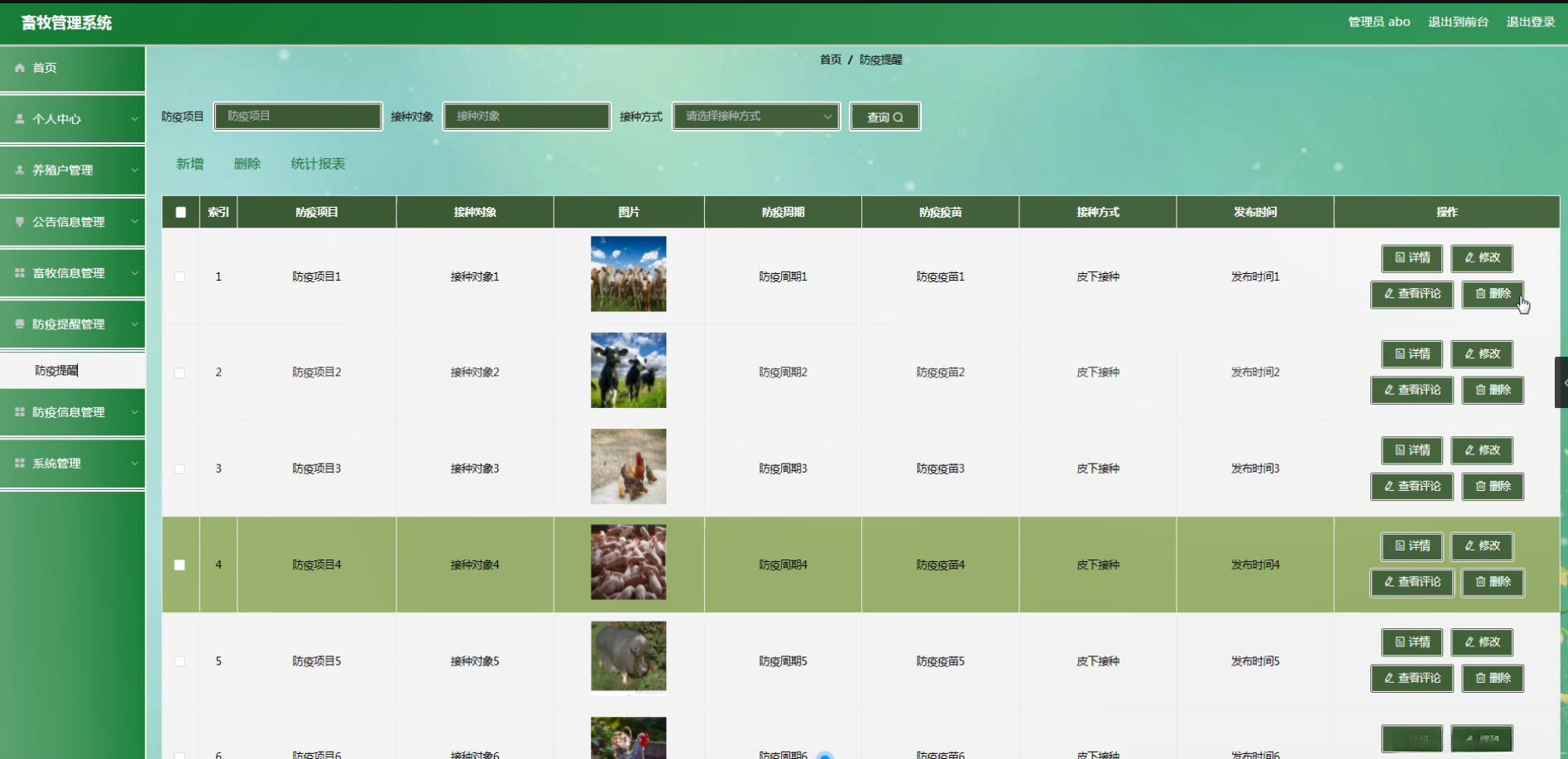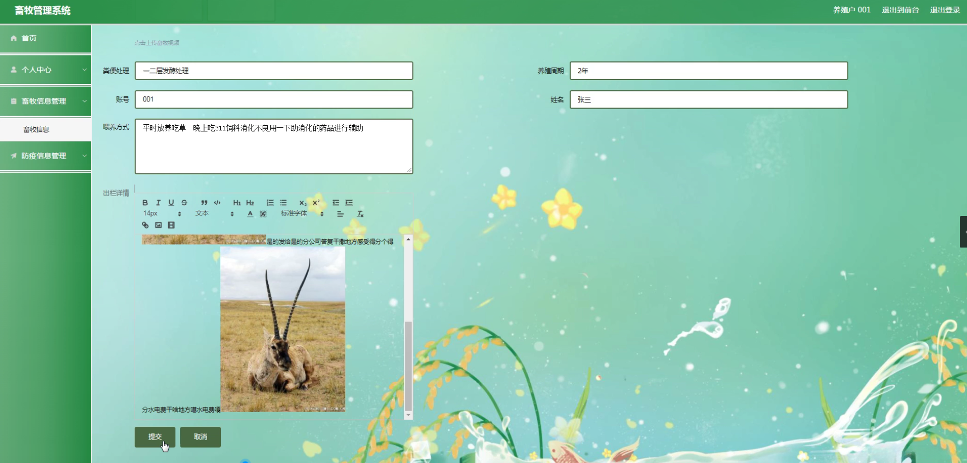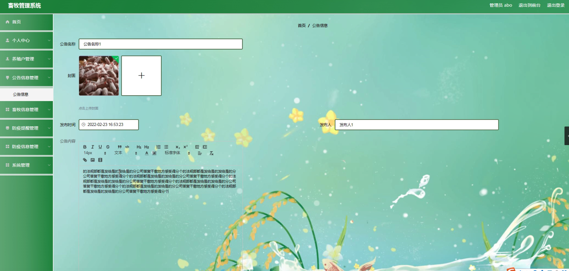 研究'畜牧业管理系统'的主要内容,则是围绕着系统的核心模块展开。该系统应具备养殖户信息管理功能, 包括基础信息录入、修改及查询等功能模块, 以便实现对养殖户的有效管理和追踪。信息发布功能则负责及时发布政策资讯及市场动态等, 促进养殖过程中的信息流通与资源共享。此外, 畜牧数据记录分析功能旨在通过记录饲料使用情况、动物生长轨迹以及疾病发生状况等内容, 为养殖决策提供科学依据