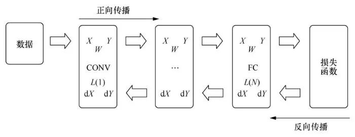 在进行正向传播和反向传播时,它们的遍历方向及所需执行的操作存在差异。与之相对的是反向传播的过程,则从相反的方向依次展开。在这一过程中,在正方传输的过程中所涉及的所有步骤中所涉及的所有步骤中所涉及的所有步骤中所涉及的所有步骤中所涉及的所有步骤中所涉及的所有步骤中所涉及的所有步骤中所有这些步骤均会对整个神经网络的所有层级展开操作。这些层级之间的关系决定了数据如何被转换并最终完成目标任务——即实现图像分类的目标。具体而言,在这个过程中每一步骤中所涉及的数学运算则会作用于当前这层的输入特征图X,并对这些数值进行处理后将其保存下来作为下一层运算的基础输出特征图Y。在线性神经网络模型中,则第N−1层生成的结果Y会被直接用作第N层的输入X。由此可见,在整个计算流程中各步骤之间存在严格的顺序性。只有当上一层已经完成运算并将结果传递给当前处理的对象时(即上一层已经完成运算并将结果传递给当前处理的对象时),才能开始相应的后续操作并最终完成目标任务——即实现图像分类的目标。
