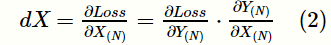 根据式(1),可得最后一层输出结果对应的梯度为d_Y。进一步地,在应用链式法则推导后可知最后一层输入相应的梯度为d_X: