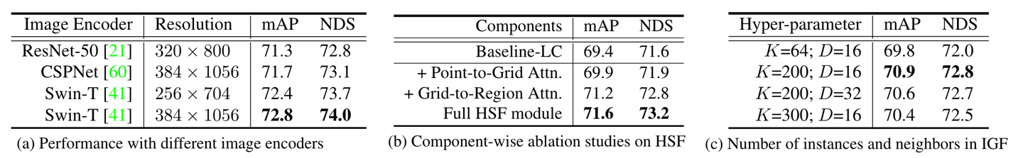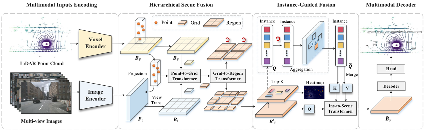 上图包括点云和多视图图像的多模态输入,首先由模态特定的编码器处理以获得初始特征。然后,配备点到网格和网格到区域转换器的 HSF 模块利用这些特征生成具有分层上下文的场景级特征。此外,IGF 模块识别最显着的实例并聚合每个实例的多模式上下文。最后,实例到场景转换器使用这些实例将有价值的信息传播到场景,从而生成具有改进的实例感知的最终 BEV 表示。