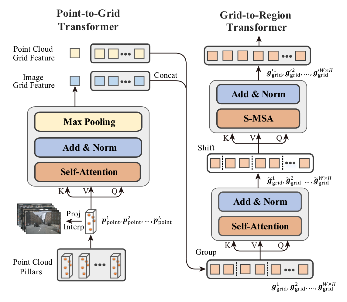 这里,f P2G(⋅)考虑每个BEV网格中的点/像素间相关性,而f G2R(⋅)进一步挖掘网格间和区域间多模态场景上下文。直觉是不同的特征粒度捕获不同级别的场景上下文。例如,在点级别,每个元素提供有关对象的特定组件的详细信息。相比之下,网格/区域级别的特征能够捕获更广泛的场景结构和对象的分布。因此,HSF 充分利用了各种表示粒度。