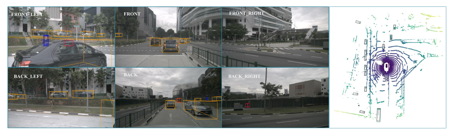 在多视图图像中用橙色、蓝色和红色可视化汽车、行人和自行车的 3D 边界框。在点云中,预测为灰色,GT 为绿色。