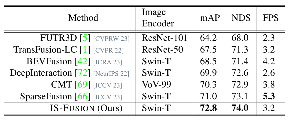 nuScenes 验证集上的性能比较。IS-Fusion 实现了卓越的 3D 检测性能,同时保持了相当的推理速度。