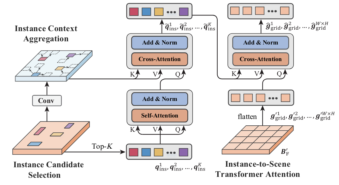实例上下文聚合。设计f agg(⋅)来计算实例到实例和实例到上下文的交互。在典型的驾驶场景中,经常观察到行人往往成群出现,车辆通常并存于路边。因此,研究实例之间的相关性至关重要。为此,在所选实例