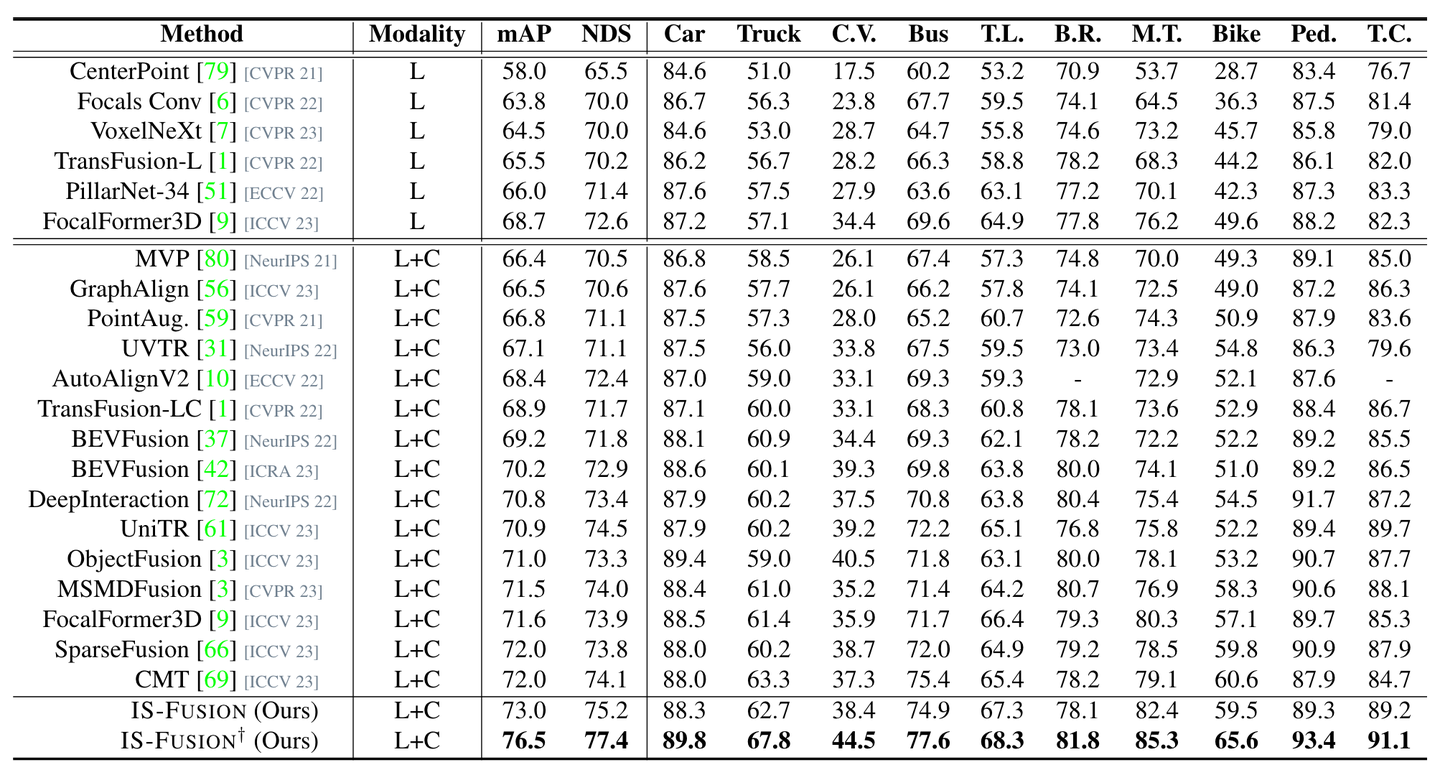 “L”是激光雷达,“C”表示相机。 “C.V.”、“T.L.”、“B.R.”、“M.T.”、“Ped.”和“T.C.”分别表示施工车辆、拖车、障碍物、摩托车、行人和交通锥。 “†”表示具有测试时间增强和模型集成技术的模型。每列中的最佳结果以粗体标记。与所有其他已发布的 3D 检测工作相比,IS-Fusion 实现了卓越的性能。