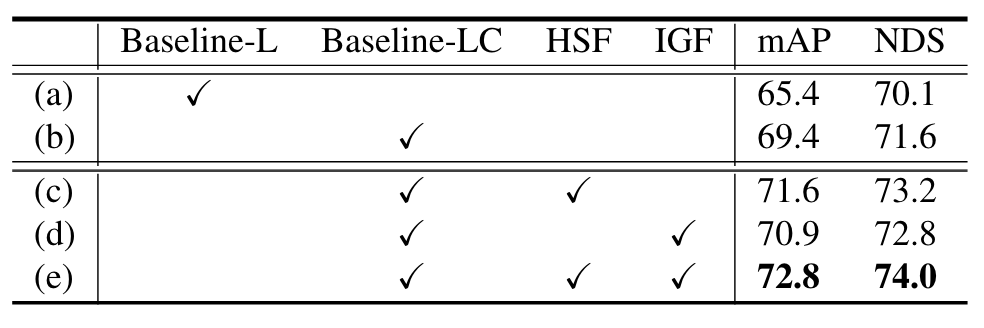 IS-Fusion 中每个模块在 nuScenes 验证集上的消融研究。 Baseline-L 表示仅使用 LiDAR 的基线,而 Baseline-LC 是指不使用 HSF 或 IGF 模块的 IS-Fusion 的简单变体。