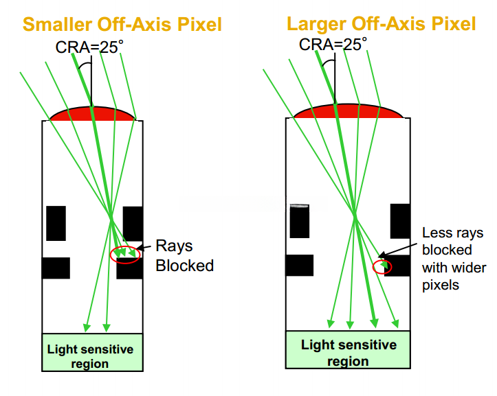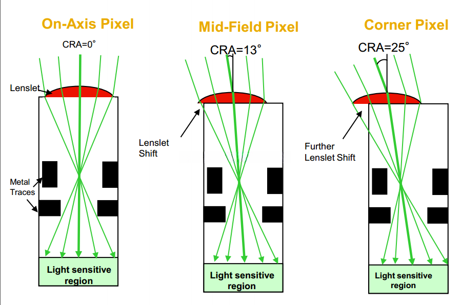 众所周知,在传感器领域中,其性能与其自身的灵敏度以及光束照射角度密切相关。具体而言,在每个像素(pixel)中光束入射的角度则取决于镜头(Lens)的 chief ray angle(CRA)以及传感器上的微透镜开孔布局(specifically, the sensor's own Micro Lens aperture layout)。