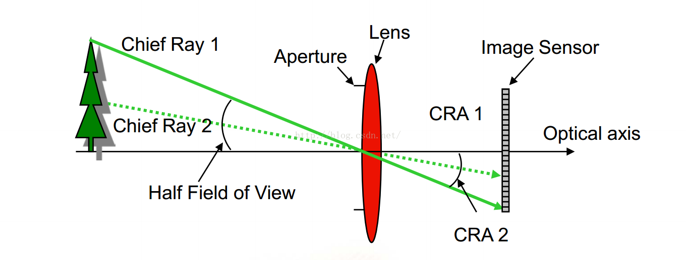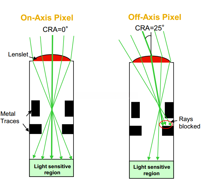 光线进入每一个像数的角度将取决于该像素所处的位置;当该像素与其轴心线的距离越大时(即越远离轴心线),其光线进入像数的角度也会变得更大。CRA值与该像素在CCD传感器中的位置相关。