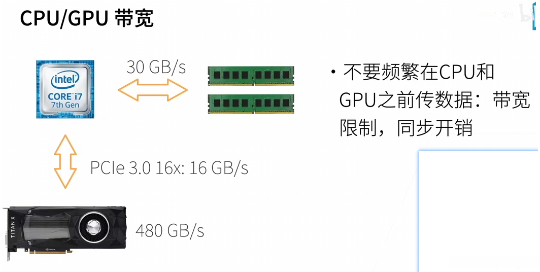 文本解释强调了以下内容:"避免频繁在CPU与GPU之间进行数据交换:带宽瓶颈及同步延迟"。这是因为CPUs与GPUs之间的数据传输速率远低于各自内部专用带宽的容量。因此,在编程过程中若频繁进行CPU与GPU之间的数据交换可能导致系统性能受限。为了优化系统性能,在编程实现中建议尽可能减少CPU与GPU之间每次的数据交互次数,并适当提高每次交互的数据量以缓解带宽限制的影响。