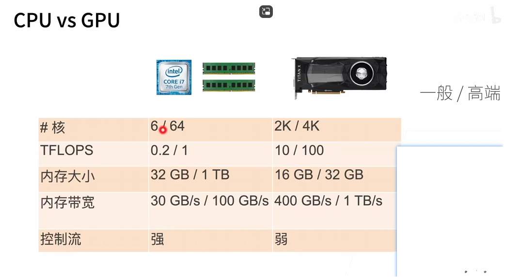 这张图片对比了CPU和GPU的主要特性。具体来说: