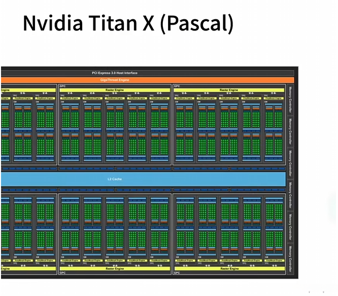 这张图片呈现的是NVIDIA Titan X Pascal显卡的架构构成模式。具体来说它详细展示了一块GPU芯片的不同组成部分