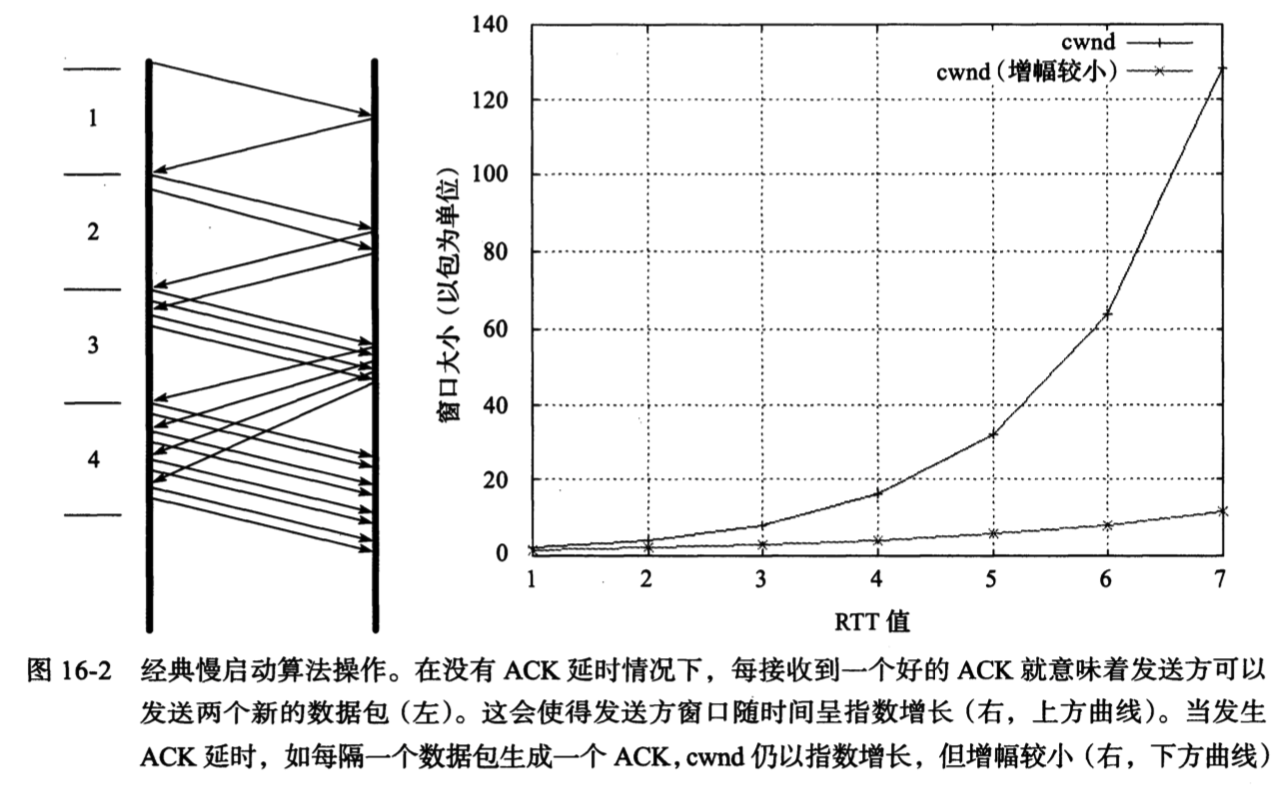 ip tcp_metrics 命令查看) - 接收到一个数据段的 ACK 后, 通常 cwnd 的值会增加到 2(开始假设为 1的话). 接着发送两个数据段. 如果也成功收到, 则 cwnd 会由 2 变成 4, 由 4 变成 8, 以此类推. 在 k 轮之后 W 的值为 W = 2^k. 最终 cwnd 增加到很大, 会导致网络瘫痪. 当出现时, cwnd 会大幅度减小(原值的一半). 这是 TCP 由慢启动阶段至拥塞避免阶段的转折点, 与 cwnd 和 ssthred 相关.