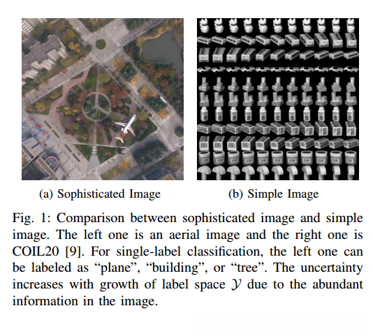 图1给出了分类任务的两个图像数据集。左图是航拍图像,其中标签空间服从于Y ={平面,建筑,树,…}。因此,它可能被标记为“飞机”、“建筑”或“树”。这也是标签平滑的目的。不确定标签增加了T的复杂性。相反,在没有复杂背景的物体的纯图像上进行分类更为简单。