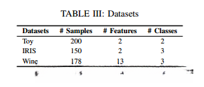 数据集设置:实验分为分类、聚类、降维三个任务。在分类聚类方面,共使用了3个数据集来研究π噪声校正的性能,包括一个合成数据集和2个UCI[18]数据集。对于每个数据集,每个类都有相同数量的样本。这些数据集的详细情况见表三。