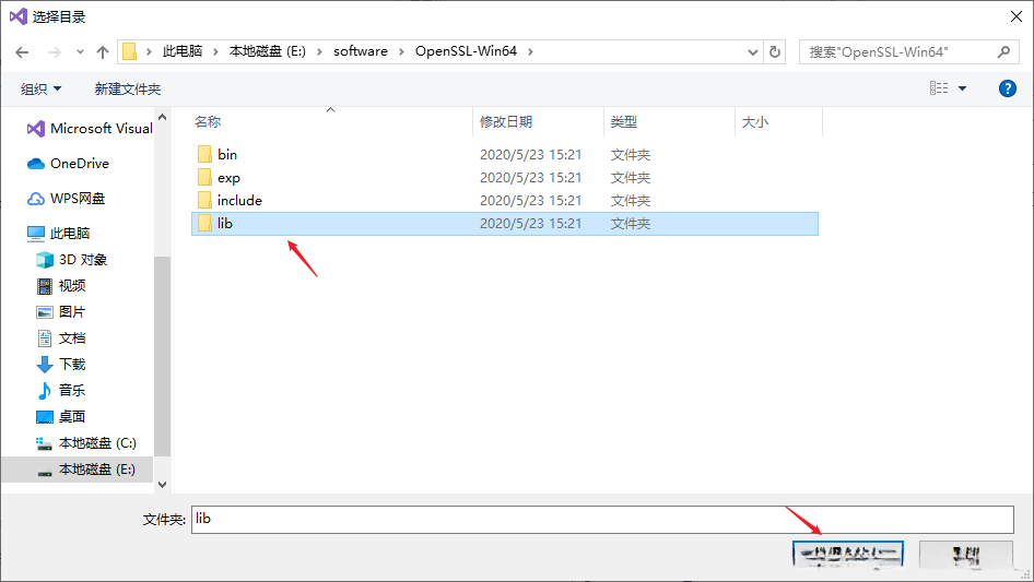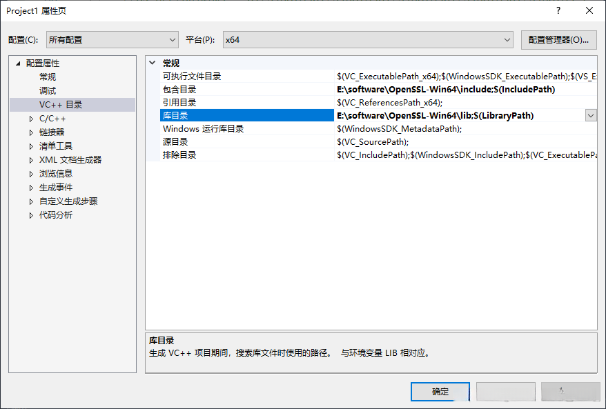 5. 将OpenSSL目录中的 lib文件夹加入“库目录”