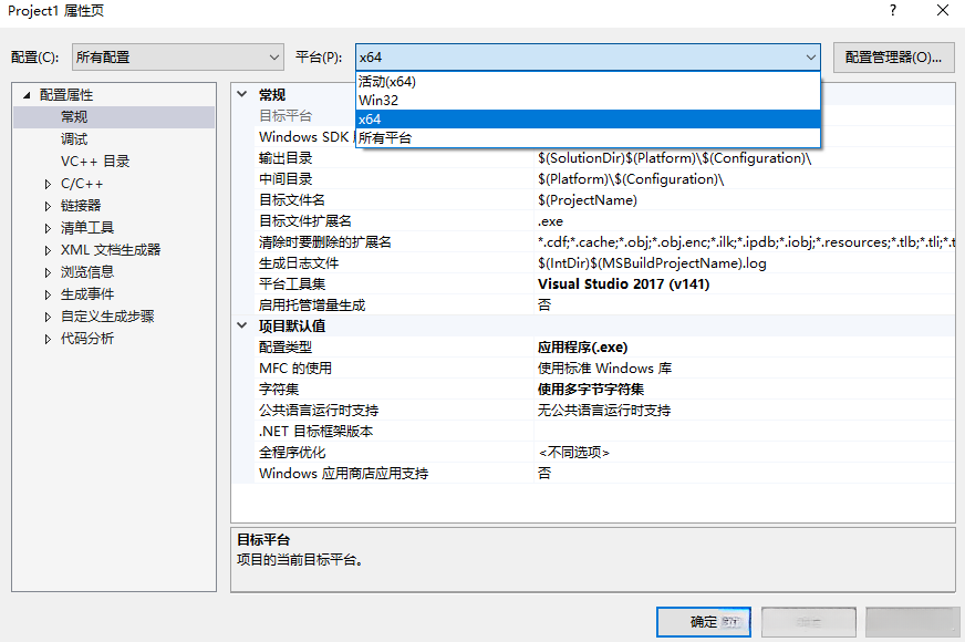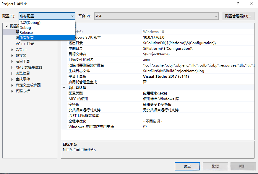 2. 打开项目→属性,选择“所有配置”