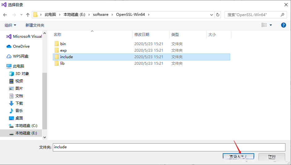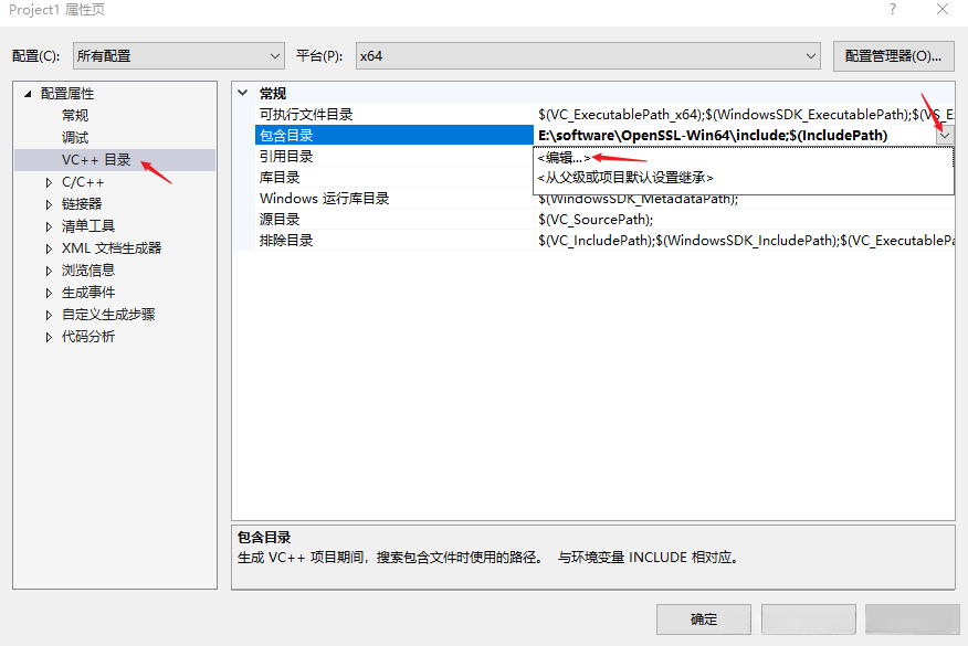 4. 将OpenSSL中的 include文件夹加入“包含目录”
