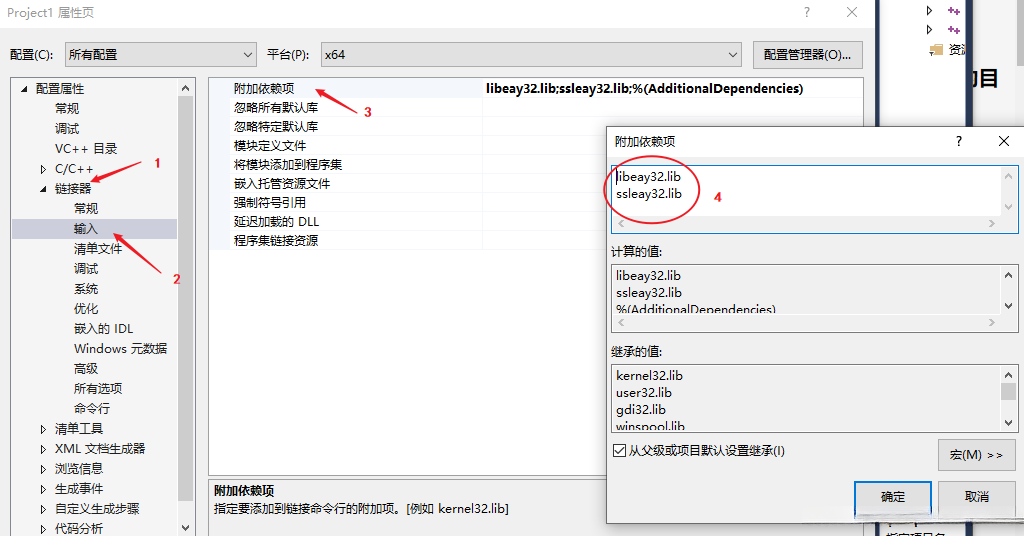 5. 链接器→输入→附加依赖项→添加“libeay32.lib“和”ssleay32.lib“