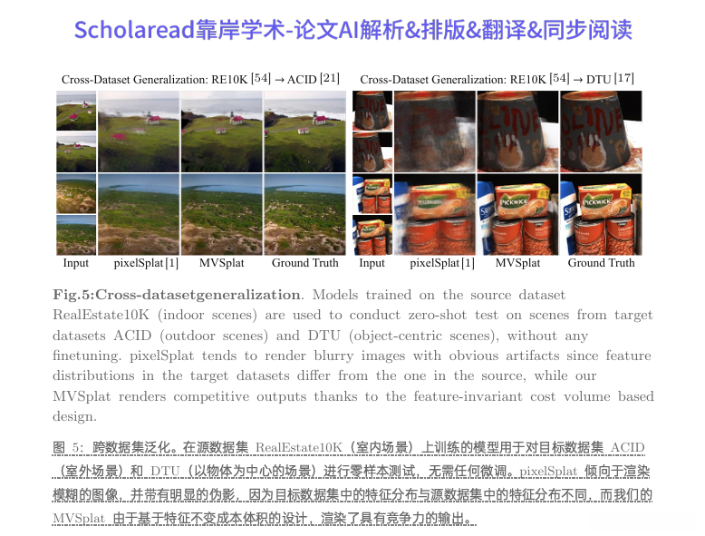 在 RealEstate10K 和 ACID 数据集上,MVSplat 在所有视觉指标上均优于先前的最先进模型,且推理时间最快,模型尺寸轻量级。在跨数据集泛化能力方面,MVSplat 也表现出色,优于 pixelSplat。