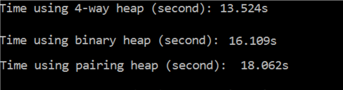 采用三种优先队列对一百万大量数据进行十次构建Huffman树所需的时间如下所述。总体而言,在相同的数据规模下深度优先堆与最小堆所花时间基本相当。这是因为两者均基于数组结构实现。