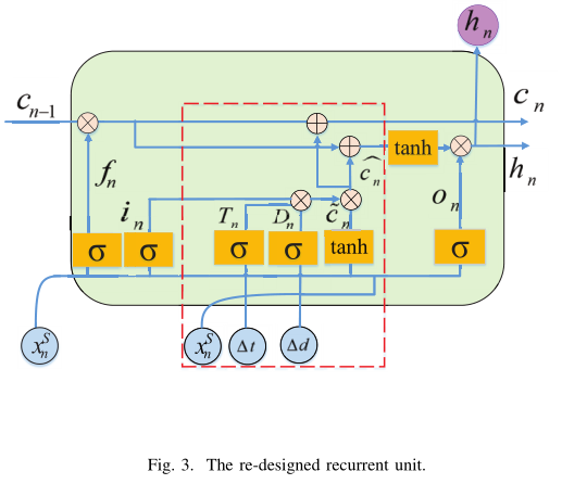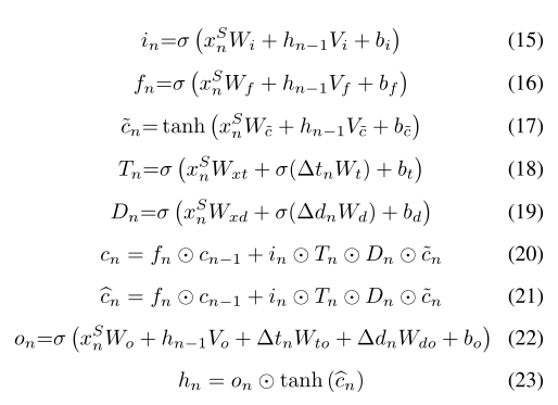 包含\Delta t_n和\Delta d_n依赖信息的记忆状态c_n可以通过公式(20)传递到c_{n+1}, c_{n+2}, …
