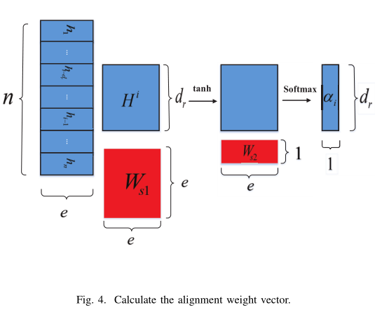 在公式(24)中,H^i表示需要加权的隐向量[h_{i−d_r},···,h_{i−1}]部分。如图4和公式(25)所示,H^i用于计算对准加权向量( alignment weight vector )α_i。