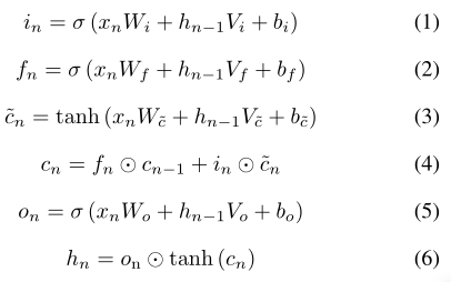 V_i、V_f、V_{\tilde c}、V_o:隐藏层输入向量h_{n-1}的权重向量