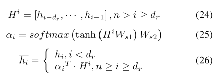 公式(26)中,如果i大于注意力深度dr,则\bar {h_i}等于{α_i}^T \cdot H^i; 否则\bar {h_i}等于原隐藏向量h_i。新计算的\bar {h_i}与历史向量[h_{i−d_r},···,h_{i−1}]相关,从而将历史信息纳入递归模型训练中,增强 历史信息 的作用。
