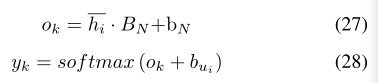 - 最后,我们将o_k和b_{u_i}相加,作为softmax的输入,得到向量y_k。见式(28)。