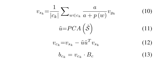 对于一个包含语义的文本信息c_k,我们使用预先训练的词向量v_{g_k}来表示每个词w。首先,所有词向量v_{g_k}由a和p(w)加权,这里a是预定义参数,默认设置为0.0001。p(w)是该词在语料库中出现的频率。然后通过求和再平均获得向量v_{s_k}(