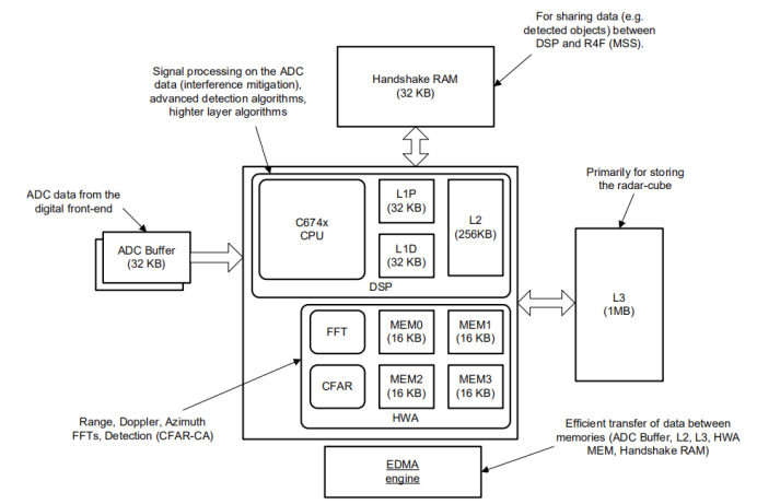 DSP子系统包括TI的标准TMS320C674x兆模块以及内部模块记忆(L1P、L1D和L2)等硬件加速器。其中一种关键的技术是雷达硬件加速器(HWA),它能够显著减轻主处理器在FMCW雷达信号处理中的负担。FMCW雷达信号处理主要涉及利用快速傅里叶变换(FFT)以及对数幅度计算来生成覆盖不同距离、速度和角度的雷达图像信息。此外,在HWA内部即可完成一些常见的功能处理工作的同时仍保持了在主处理器上实现其他专用算法的能力