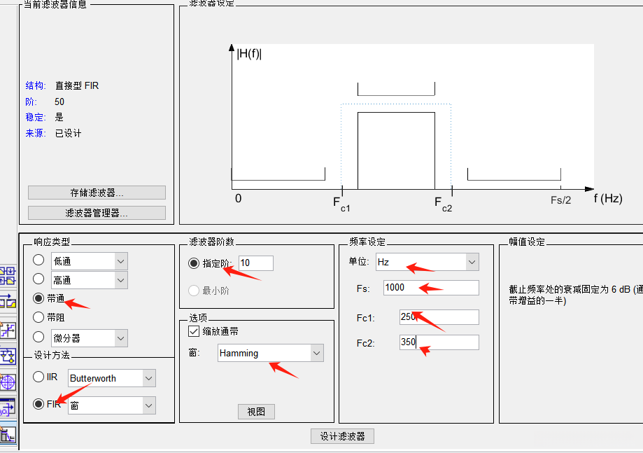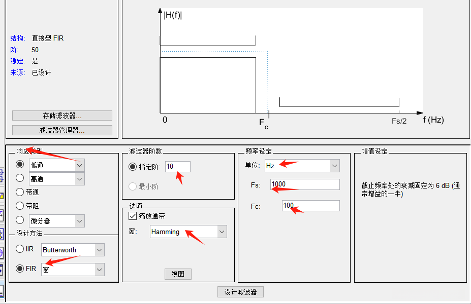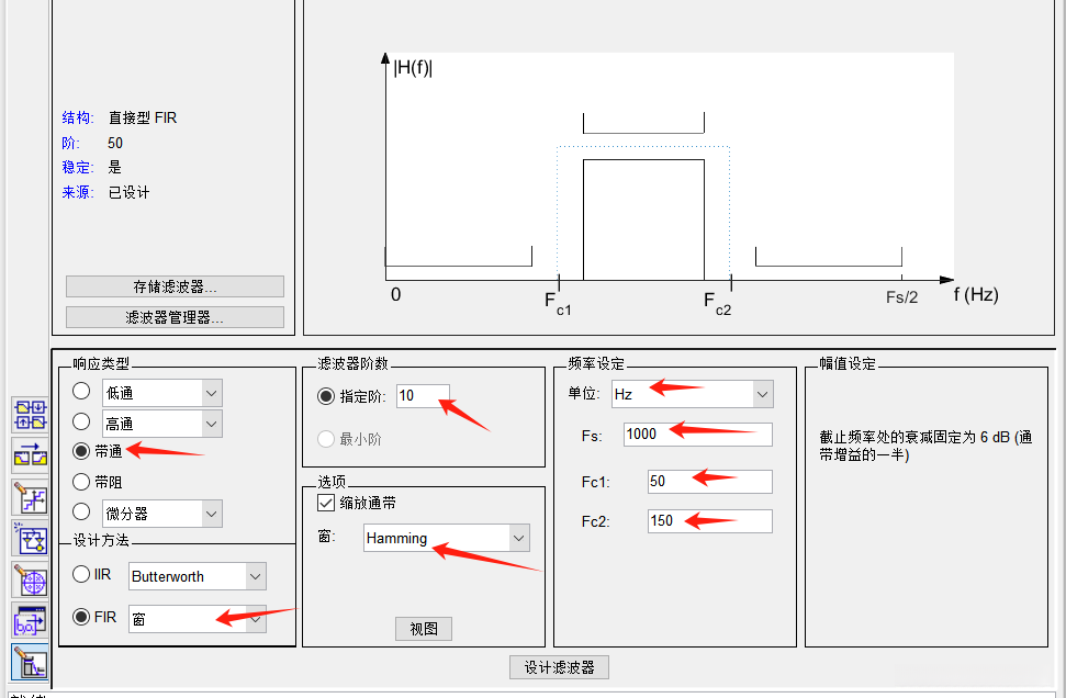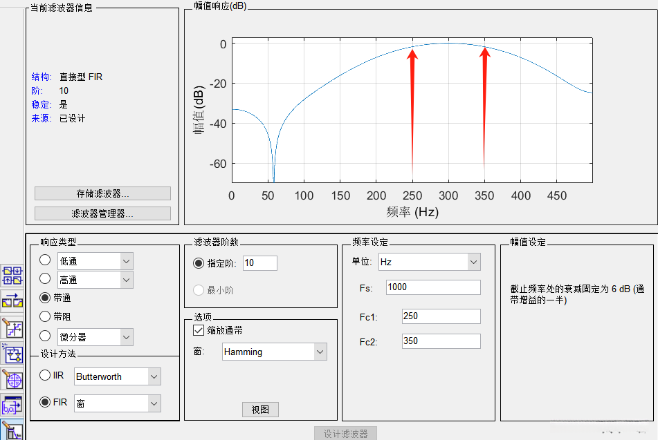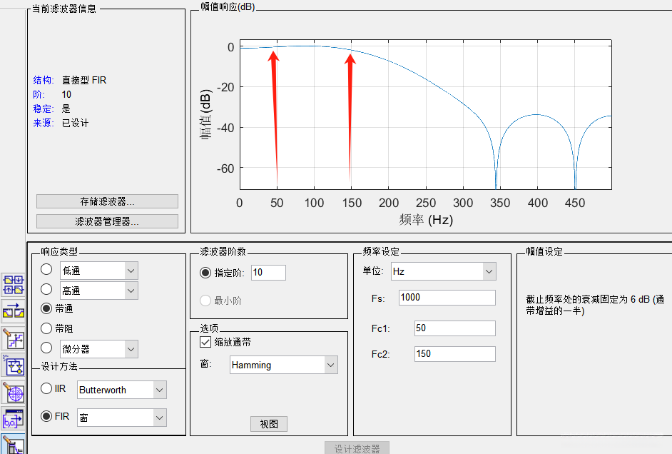 在本研究中所采用的滤波器阶数定为10级,在实际应用中发现更高阶数的滤波器可能会带来更优的效果。后续可以通过对比实验来验证效果。采样频率按照题目所述设置为1KHz。