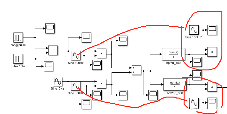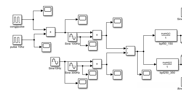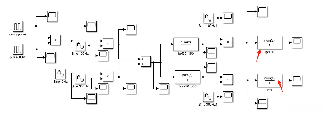 由于10Hz的方波与100Hz的载波相乘得到一个调幅信号,在其频谱中主要集中在90Hz至110Hz的范围内(注:需要注意的是,在实际应用中我们通常只关注基频成分即该调制信号的主频为10Hz的正弦信号),因此我们需要使用带通滤波器来去除该方波信号并提取所需的基频参数;之后将剩余部分交由软件系统进行后续处理