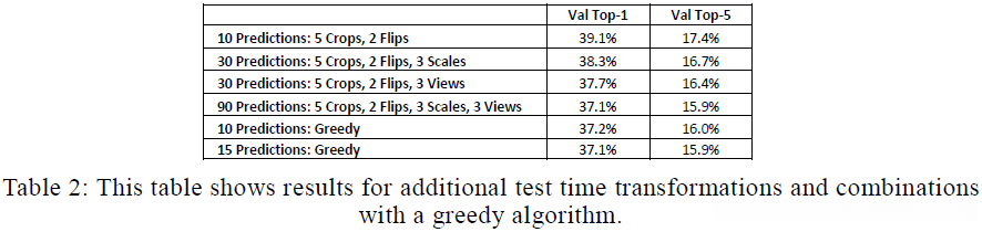 预测时,AlexNet对输入图像进行中心(1)、边角(4)裁剪并水平翻转(2),然后将10张图像分别输入网络进行预测,并对结果取众数。本文将平移(5)、水平翻转(2)、缩放(3)、视角(3)组合,共有90种不同变换,采用贪心算法(greedy algorithm)选择10种进行预测。