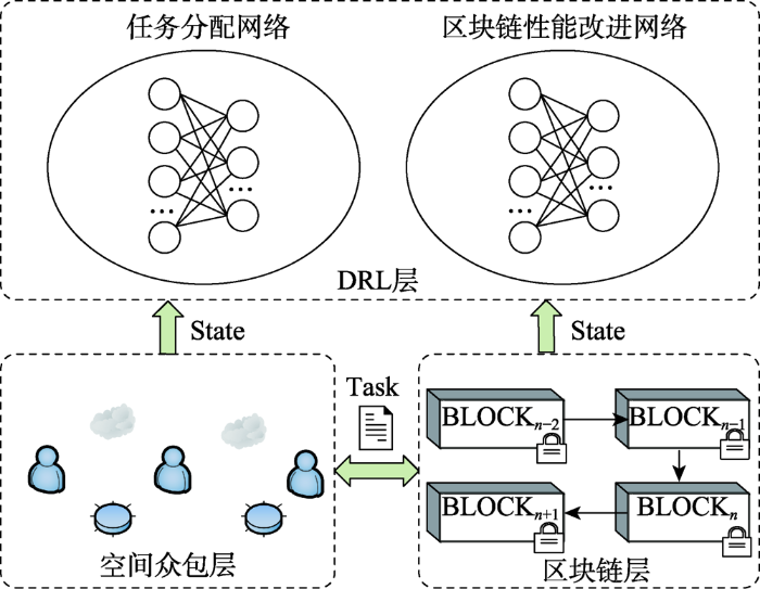 通过将区块链技术和深度强化学习(DRL)相结合,在车联网领域有效解决了空间众包中的关键挑战,并实现了数据隐私的安全性。该系统采用深度强化学习算法与区块链技术和空间众包技术协同工作模式,在确保数据安全的前提下实现了资源的有效配置和性能优化。系统通过动态优化任务分配策略以及根据系统需求自动调节共识机制、块大小及生成时间等参数设置,从而提升了整体运行效率并降低了管理复杂度。DB-SCS模型如 图 5 所示。