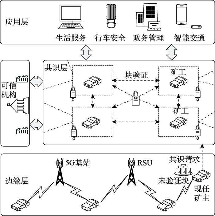 共识层:本层可构建高效的共识机制,如工作量证单机制[82]、权益证单机制[83]以及授权权益证单机制[84]等具体方案,从而降低网络规模的同时显著提升区块链系统处理交易的能力。其中每个区块节点对应于一辆车辆或一个移动侧单元(RSU)等通信终端设备。