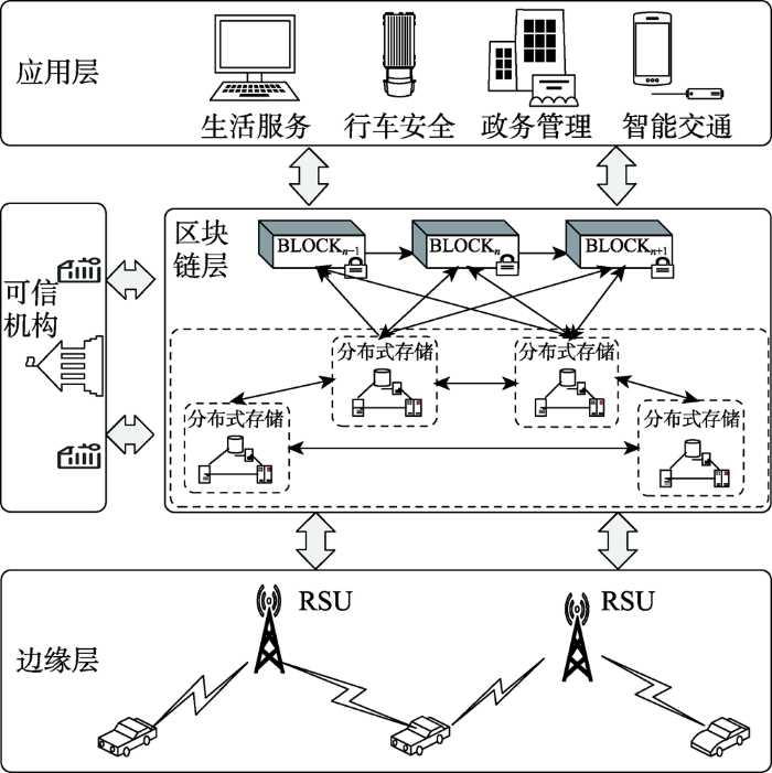 | Liu等[63] | 数据存储在RSU中 | 车辆-RSU-实体 | RSU共同维护区块的生成、验证和存储,实现分布式数据存储 |