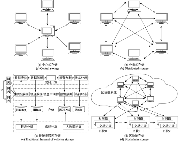 在2016年, Yuan团队[33]率先将区块链技术应用于交通领域,成功研发出一种安全可信的分布式自主交通管理系统。Leiding团队[34]致力于提升车辆间通信安全性,提出了基于以太坊架构的分布式存储方案用于车联网系统建设。文献[35 ⇓ -37]中,为保障参与信息交互车辆及交通事故取证执法机构提供可靠数据参考,区块链技术被用来建立数据分布式存储体系。如 图 4 (d)所示,该系统由大量分散节点构成,每个节点记录完整账目,避免了集中式服务器存在的故障隐患,无需依赖中心服务器保护隐私,一旦上传数据便永久存档无法篡改,确保了信息的真实性完整性以及安全性。区块链彻底取代了传统意义上的"可信赖第三方"角色